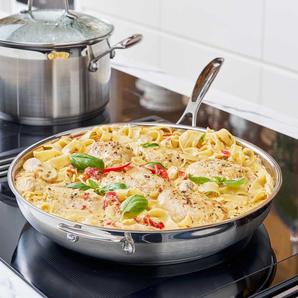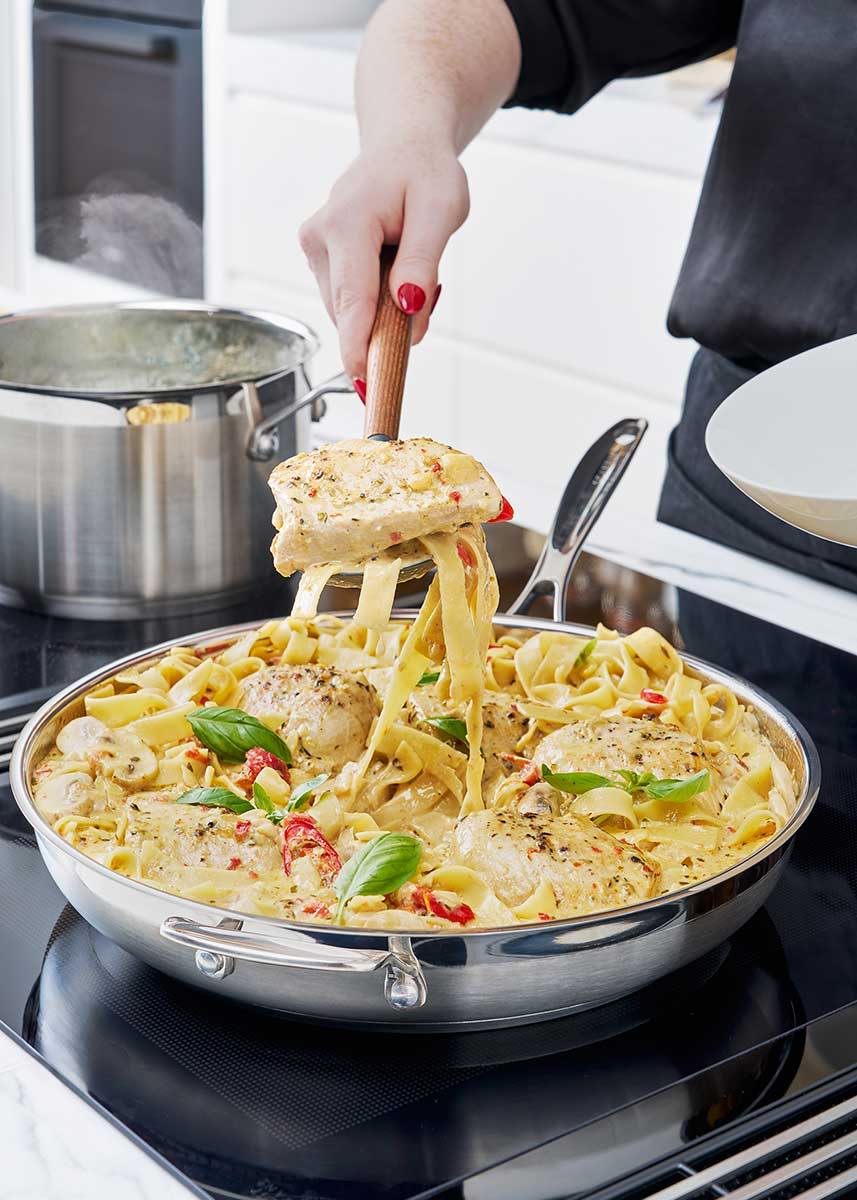 Heat olive oil in your Scanpan 32cm Family Pan over medium–high heat. Sear the chicken for 5–6 minutes per side, until golden and cooked through. Transfer to a plate and loosely cover with foil.
