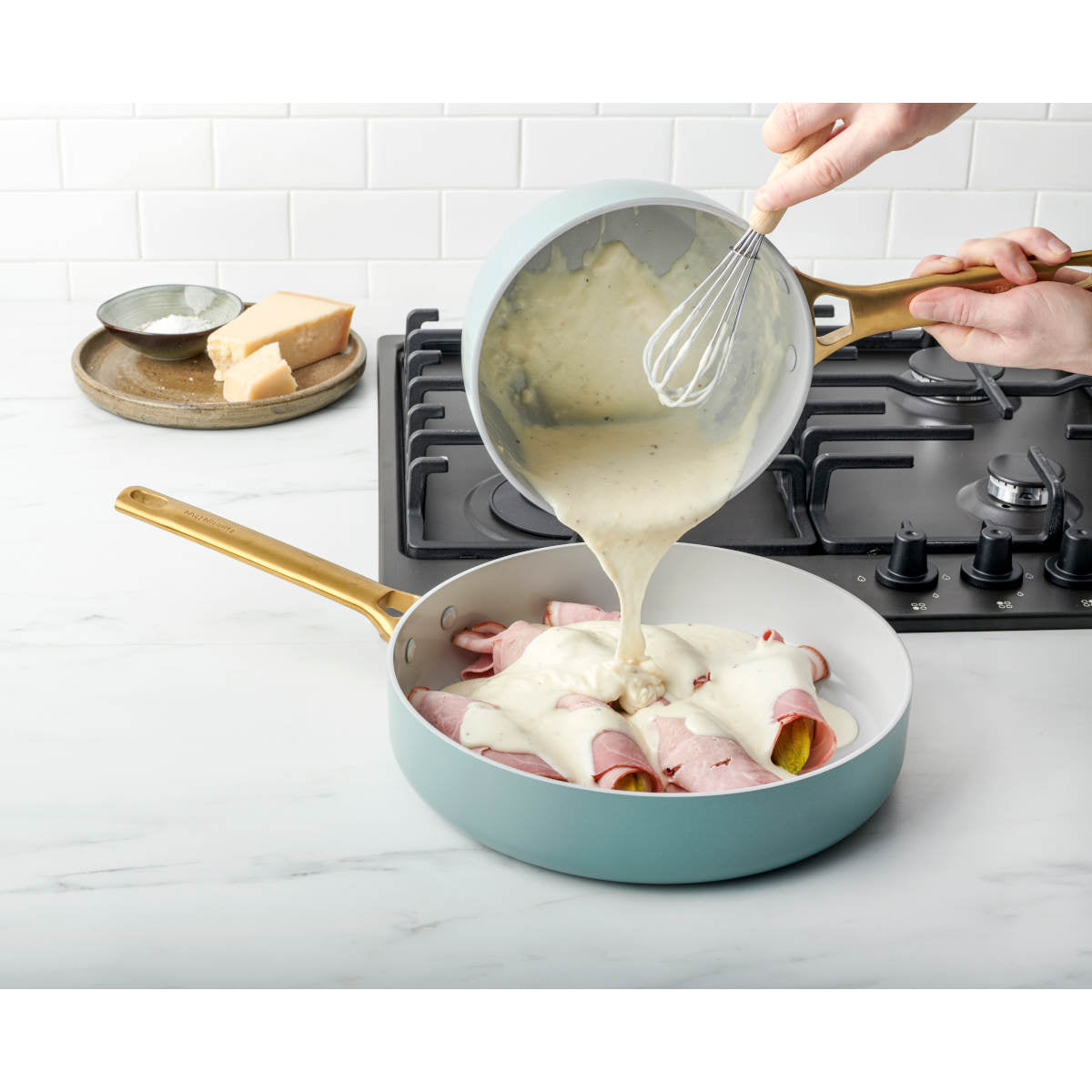 Add a splash of colour to your cooking with the Padova Skillet in Smokey Sky Blue. This pan doesn’t just look good—it’s built to handle everyday kitchen adventures with ease. The duo-forged hard anodised aluminium body is super sturdy, scratch-resistant, and distributes heat evenly to keep your meals cooking just right. The Thermolon™ ceramic non-stick coating, strengthened with diamonds, means food slides out effortlessly and cleanup’s a breeze. Plus, it’s free from PFAS, PFOA, lead, and cadmium. From golden frittatas to sizzling stir-fries, this skillet is ready for whatever’s on your menu.