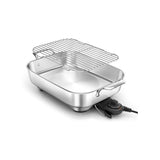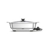 Large banquet frypan with powerful even heating. An electric thermostat and an optimally engineered heating element ensures even heat distribution and temperature control across the entire cooking surface.