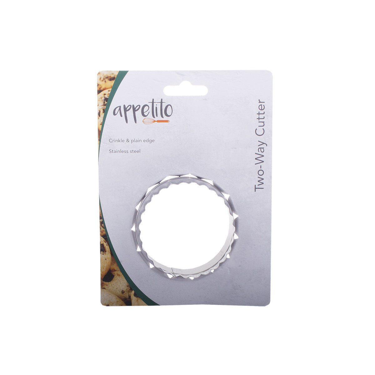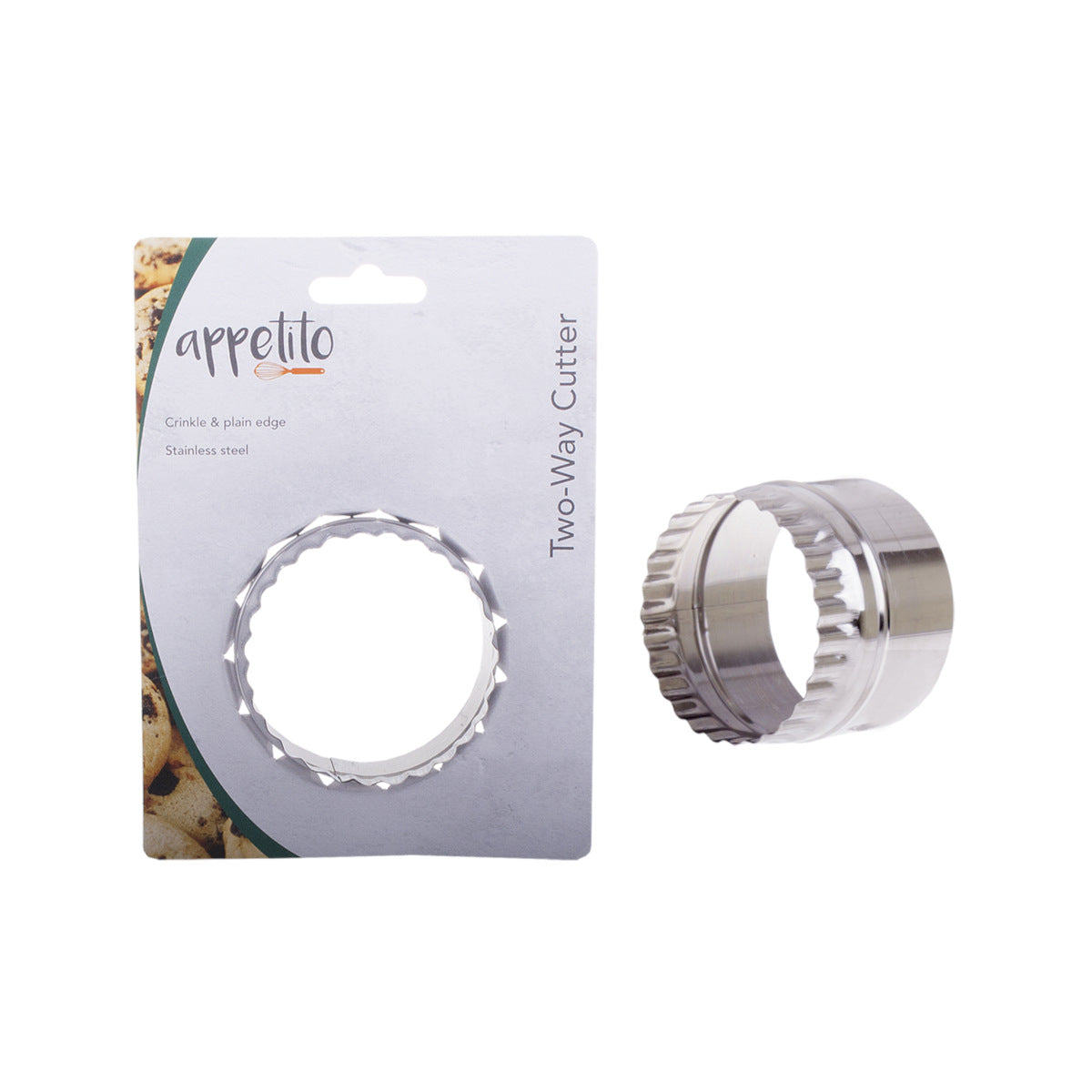 Creating dough and pastries is a breeze with the Two-Way Cutter from Appetito. Crafted from durable, easy-to-clean stainless steel, it's an essential tool for any baker. Achieve precise cuts with both the crinkle edge (6cm) and plain edge (6.5cm) sides.