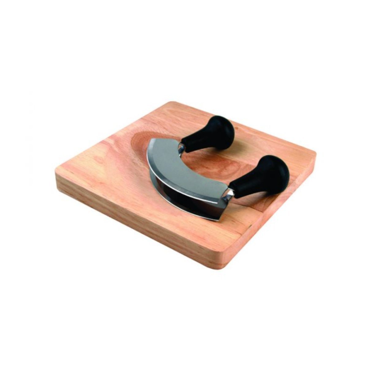 The Davis & Waddell Mezzaluna Chopper & Board Set is designed for efficient chopping of herbs, nuts, and vegetables. The mezzaluna's curved stainless steel blade allows for a smooth rocking motion, while the dual handles provide enhanced control and comfort. The accompanying wooden board features a shallow indentation to keep ingredients contained during chopping, ensuring precision and ease.