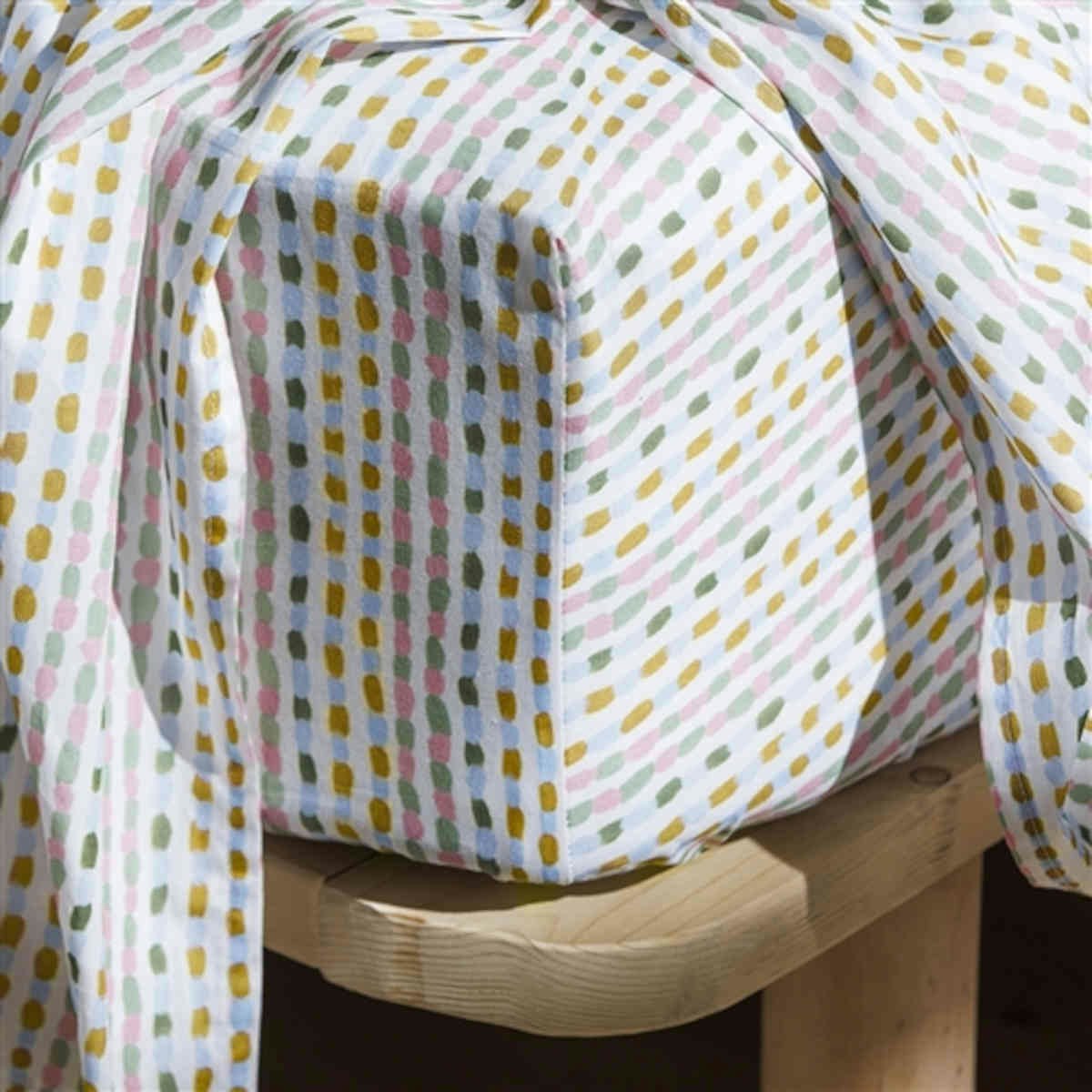 Designer Sarah Strickland’s interpretation of the elongated leaves of native she-oaks was achieved by painting in loose watercolour in a palette of earthy clay, cooling blues and refreshing greens. From afar the horizontal stripes present as a full cover of coastal beach tones while up close the intricate detail of the stippled watercolour technique can be seen. This airy summer collection features fitted and flat sheets, standard and European pillowcases as well as a lightweight, quilted throw.