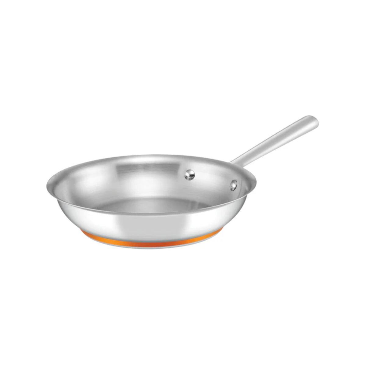 This 24cm open French skillet, made of stainless steel, is ideal for preparing larger side dishes, meats, and meals for two. It excels in achieving perfect frying and searing results.