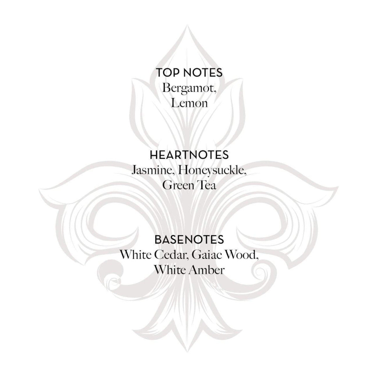 - Base Notes: white amber, guaiac wood, white cedar