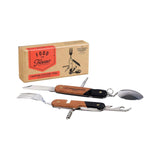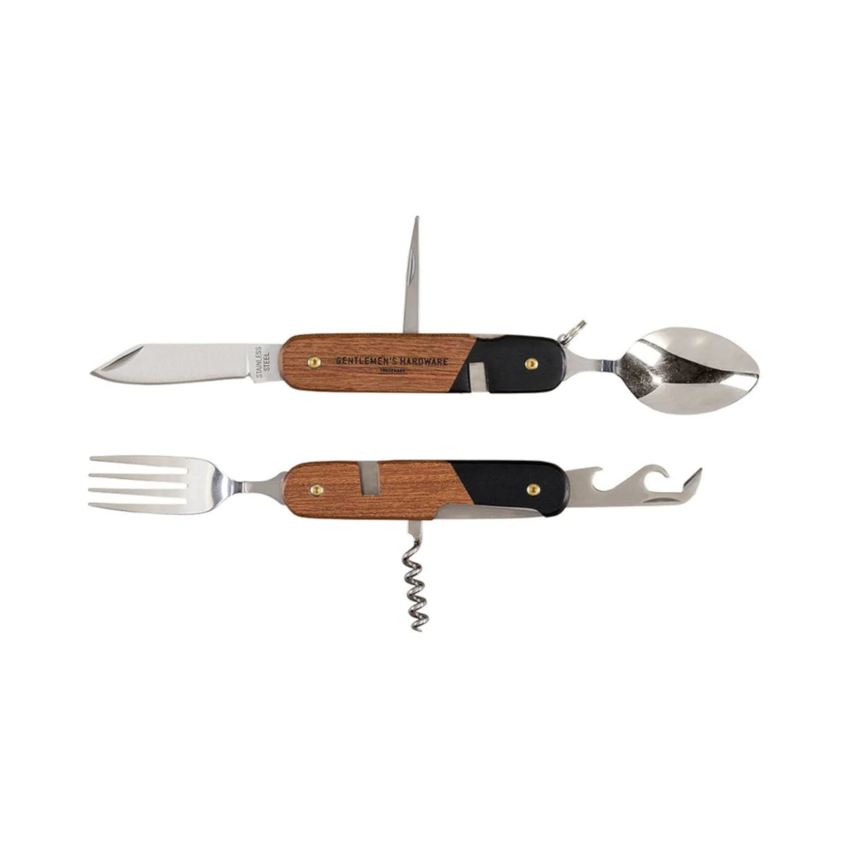 The only tool you'll probably ever need by the campfire! Gentlemen's Hardware presents the Camping Cutlery Tool, a multi-functional and exceptionally durable cutlery tool with a fork, knife, spoon, corkscrew, bottle, and can opener, as well as a short blade. The handiest of compact camping accessories, each stainless steel utensil folds neatly into a smart wood handle, and the fork and spoon are detachable for mealtimes. The Camping Cutlery Tool comes in a Gentlemen's Hardware signature-style presentation box and makes the perfect gift for camping enthusiasts everywhere.