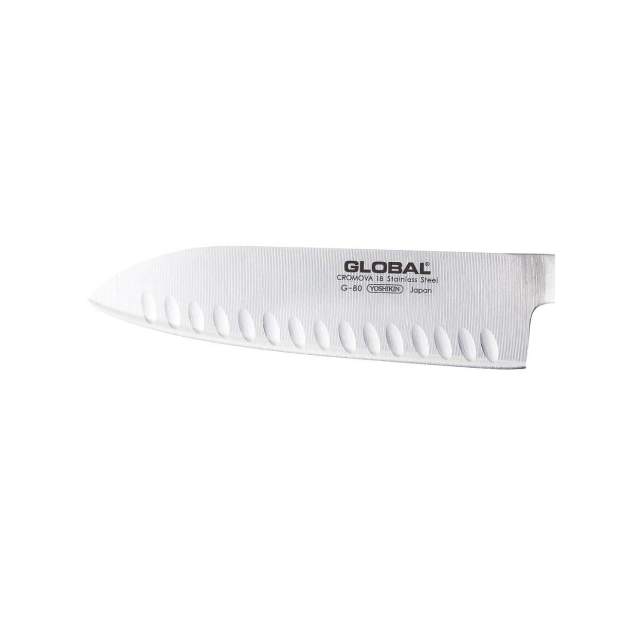 The Global Classic Fluted Santoku Knife 18cm is constructed using advanced CROMOVA 18 stainless steel with ice tempering and hardening process which generates the superior elasticity of the blade that ensures maximum sharpness for longer periods of time