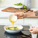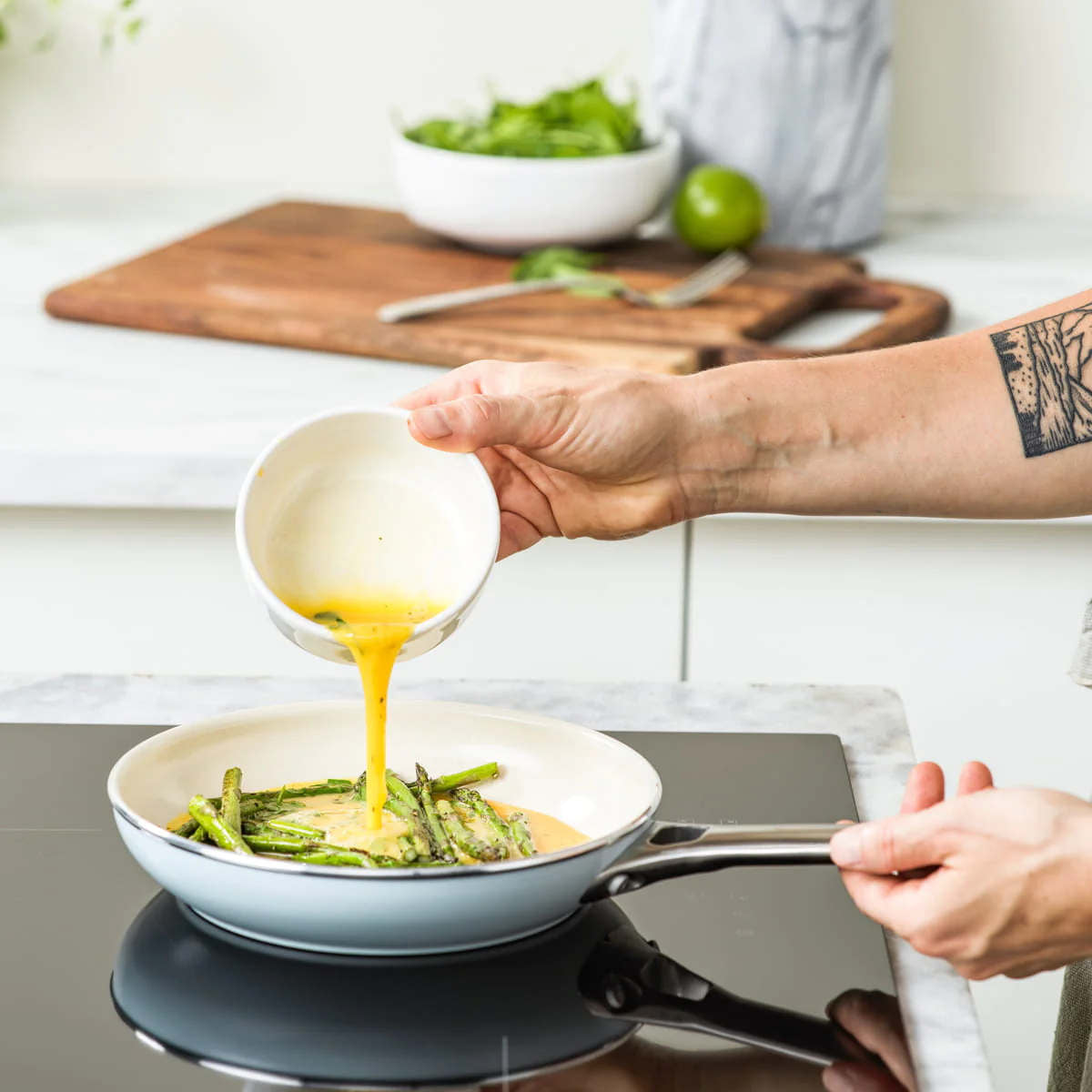 Bring some fun to your stovetop with this vibrant blue set that’s as sturdy as it is stylish. Built with duo-forged hard anodised aluminium, each piece stands up to daily use with ease while ensuring your meals cook evenly. The diamond-reinforced ceramic non-stick coating makes cooking (and cleaning) a breeze, without nasties like PFAS or PFOA. Whether you’re flipping frittatas, sizzling seafood, or whipping up a weeknight stir-fry, this set’s got you covered for all your kitchen adventures.