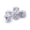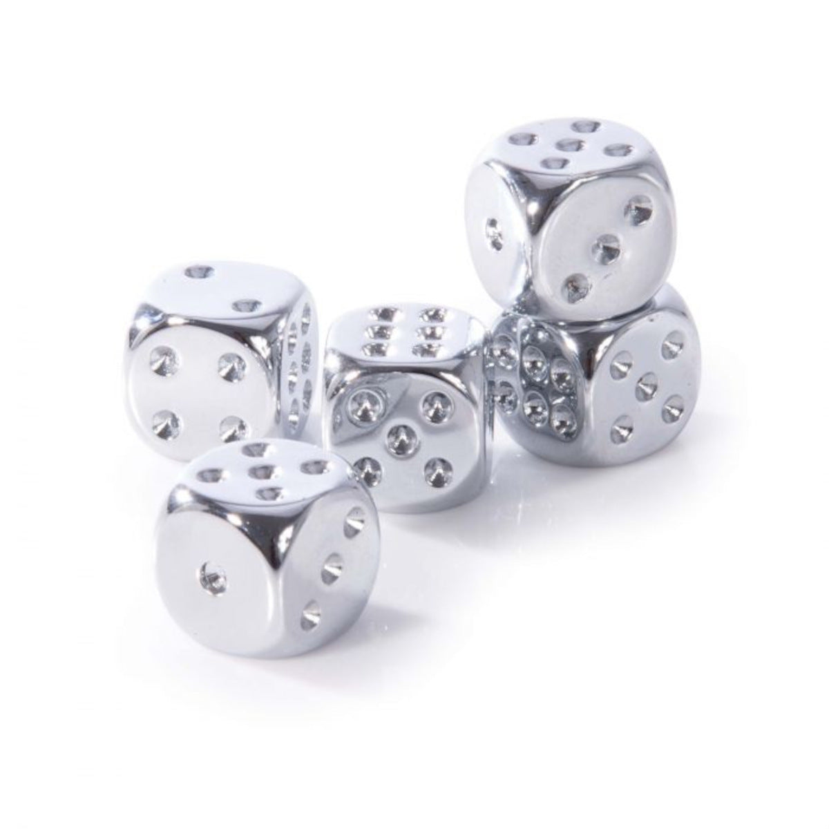 Set of 5 metallic silver Dice in a tin with a booklet containing 8 fun dice games, or perfect as a set of cool chromed dice for using with existing games