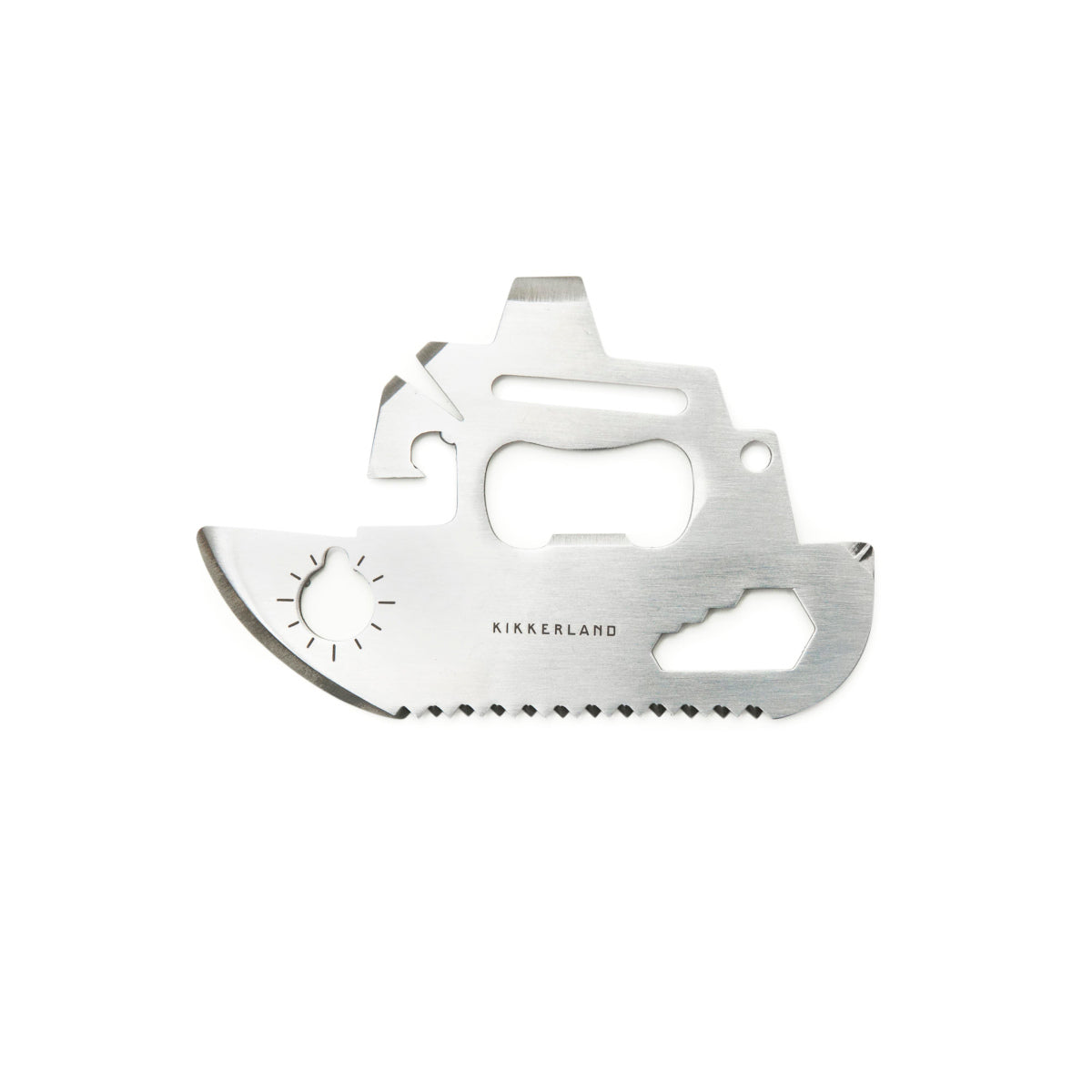 Check out the Kikkerland Boat Multi-tool in Silver, measuring 5 x 8cm. It's a handy tool with a Knife, a hole for your keys, a destination pointer, a butterfly-style wrench, and screwdrivers for both flathead and Philips screws. It also comes with a can opener, wrench, bottle opener, crowbar, and even a saw!