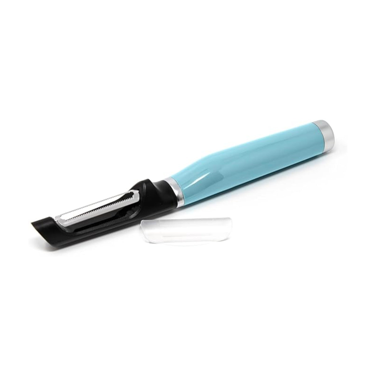 The KitchenAid Classic Euro Peeler in Mineral Water is a sleek and efficient tool designed to simplify the peeling of fruits and vegetables. Featuring a double-edged serrated blade made from rust-resistant 420 stainless steel, it effortlessly handles both tough and delicate skins. The ergonomic handle provides a comfortable grip, ensuring smooth operation during use. The peeler comes with a protective plastic blade cover, keeping the blade sharp and safe when not in use. Its elegant Mineral Water colour adds a touch of style to your kitchen tools. For added convenience, this peeler is dishwasher safe, making cleanup quick and easy.