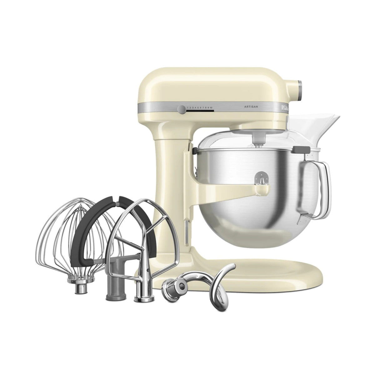 Included with this mixer are essential attachments such as a Wire Whip, Flex Edge Beater, Flat Beater, Spiral Dough Hook, and Pouring Shield.