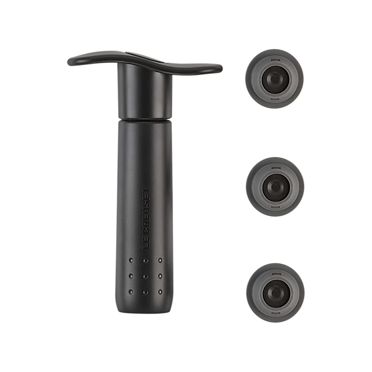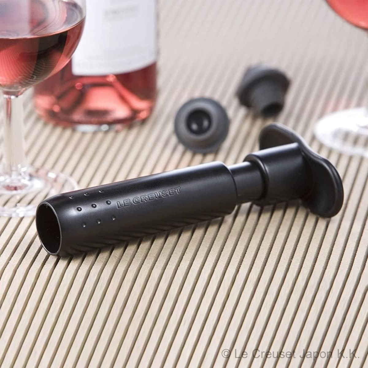 The Le Creuset metal wine pump preserves wine by removing air from inside an opened bottle, then tightly sealing it using a durable stopper. By simply placing a stopper in the bottle and pumping several times, the wine is sealed and ready for storage.