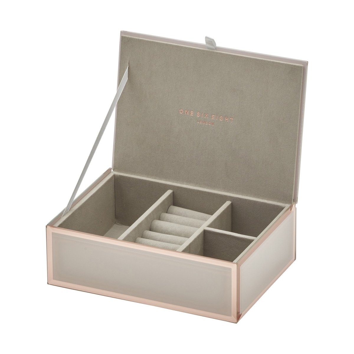 Crafted from premium materials, with superior construction, this jewelry box has room for you to store all of your essentials. The smooth, rich finish shines in the light and will look lovely sitting on any dresser top or desk space.