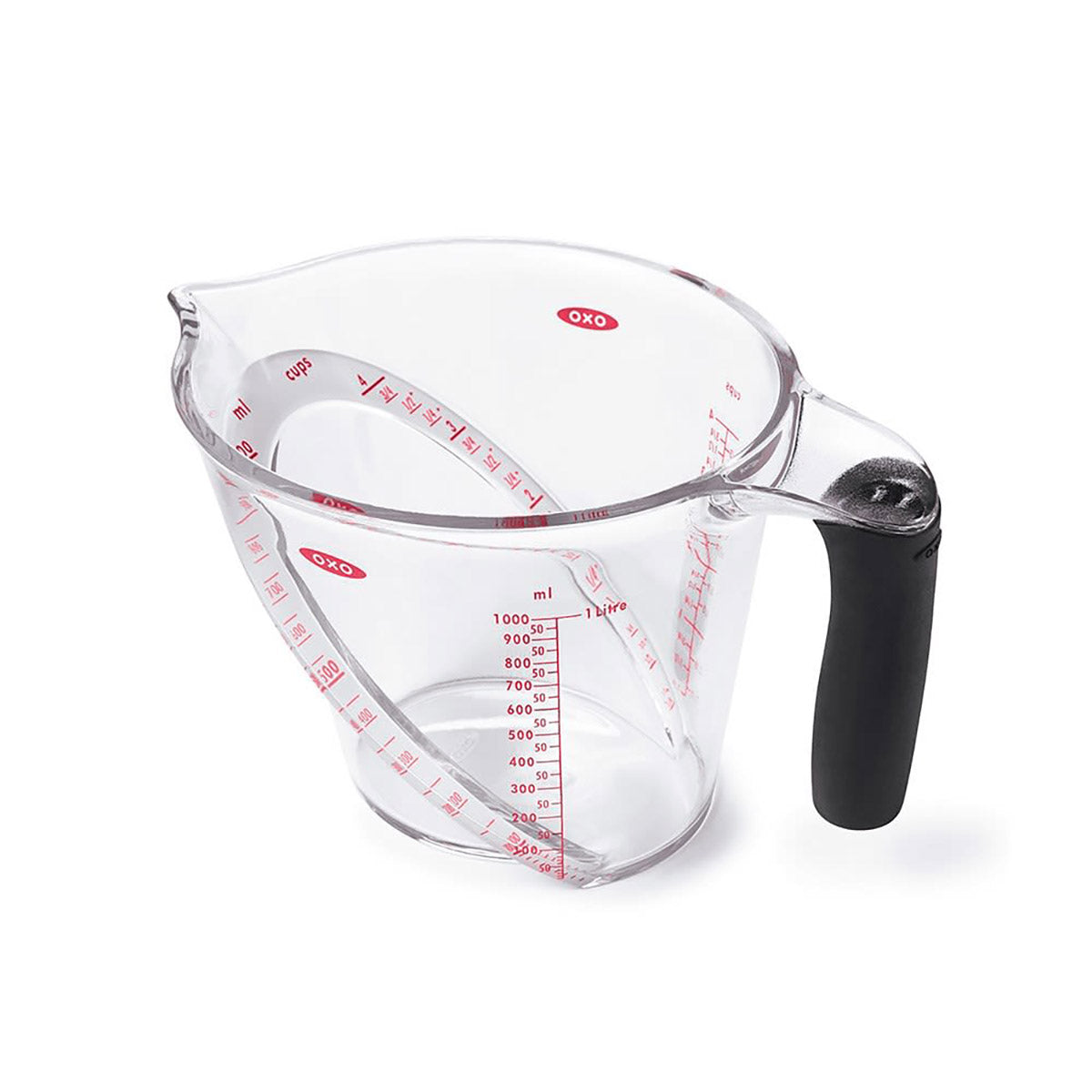 The OXO Good Grips Angled Measuring Cup 1L (4 Cup) is perfect for measuring ingredients without bending or lifting the cup to eye level. The patented angled surface allows you to see measurement markings from above as you're pouring, so you can better measure ingredients without having to bend down or lift the cup up. The clear markings for cups, ounces, and milliliters also make it easy to read measurements from above. This measuring cup is also available in 1-Cup and 2-Cup versions.