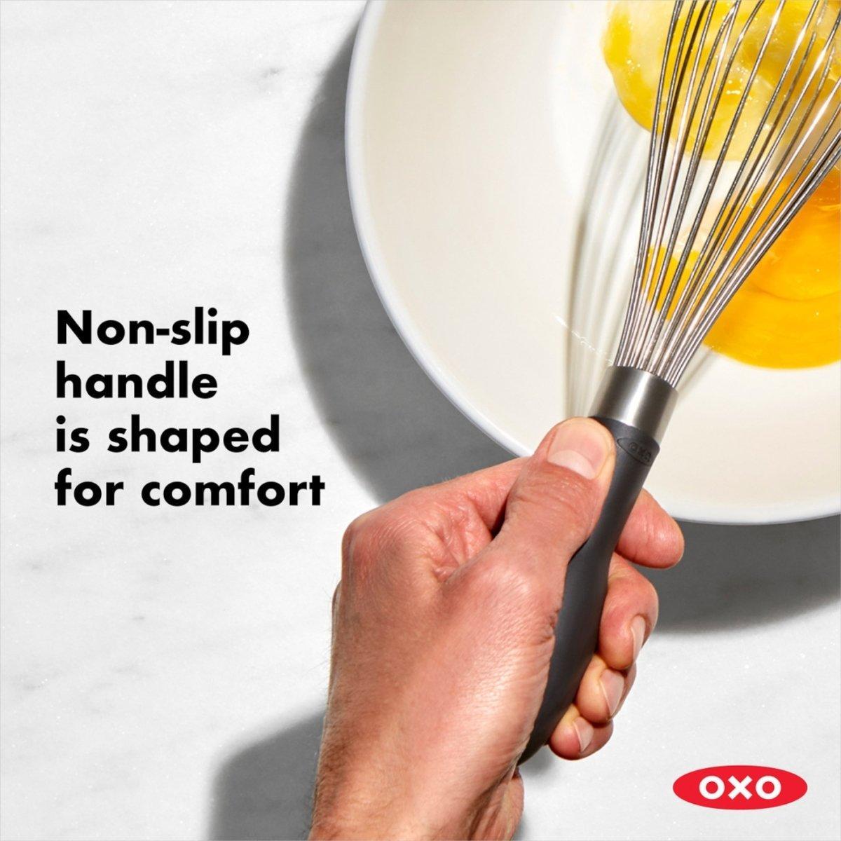 Looking for a balloon whisk that's comfortable and sturdy enough for vigorous whipping and aerating? Look no further than the OXO Good Grips Balloon Whisk! This whisk features polished stainless steel wires and a teardrop-shaped handle that fits comfortably in your hand. Plus, the soft handle won't slip even in wet hands. So go ahead and whip up some ingredients for maximum fluffiness. Your arms will thank you!
