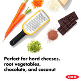 The OXO Good Grips Medium Etched Grater simplifies the task of grating and zesting a variety of ingredients, including carrots, hard cheeses, zucchini, chocolate, and more. Its ergonomic soft handle ensures a secure and slip-free grip, while the non-slip foot adds extra control when in use.