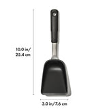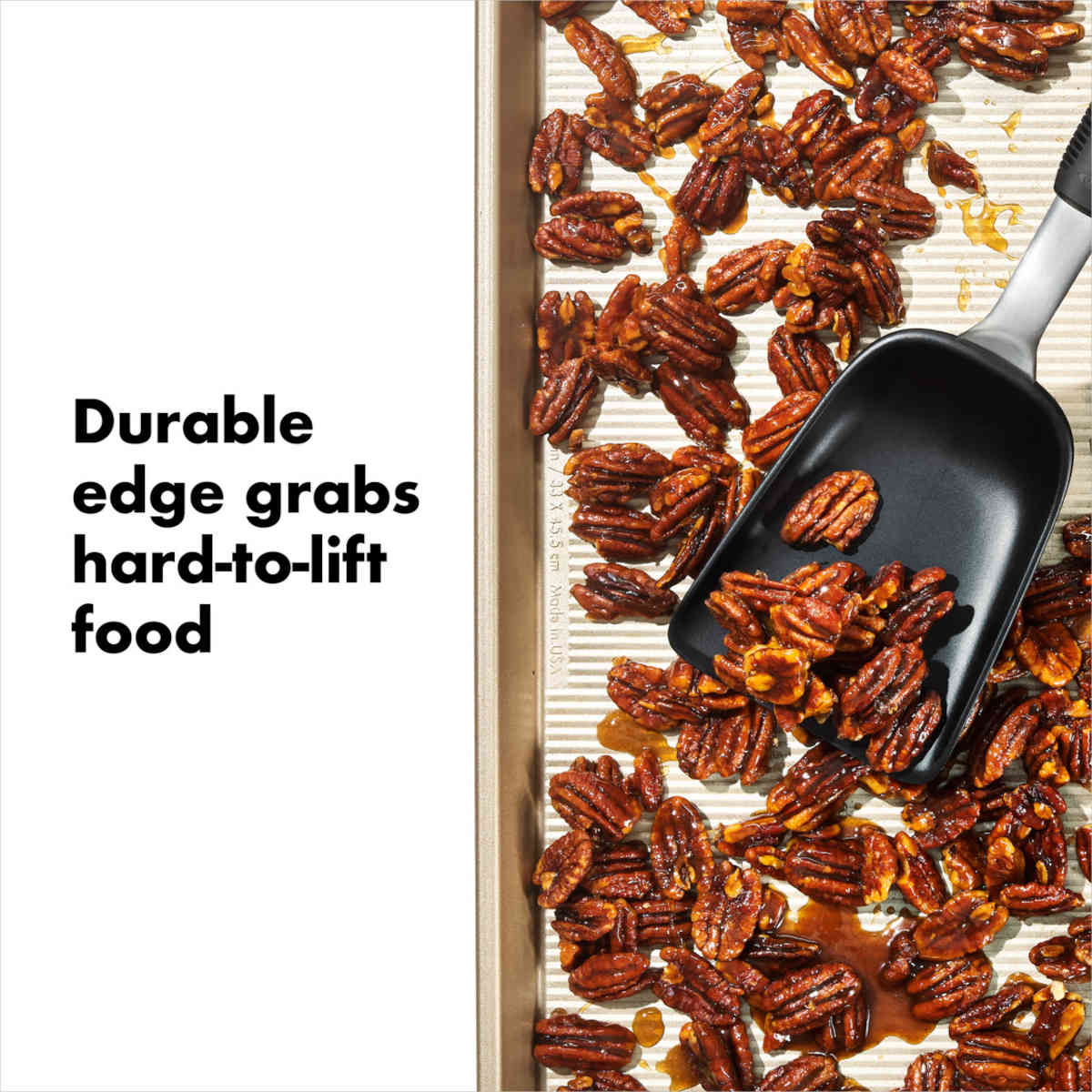 When you're catering for a group or planning meals for the upcoming week, sheet pan cooking simplifies the process. Our OXO Good Grips Sheet Pan Scoop is expertly crafted to streamline transferring your meals with minimal mess. Its broad shovel efficiently gathers up vegetables, meat, or fish, while the tapered side walls prevent spillage during serving or storage. The sturdy edge assists in lifting stuck-on foods and effortlessly removes any remaining debris from sheet pans. Constructed from heat-resistant nylon, this versatile Sheet Pan Scoop is suitable for all cookware types and is dishwasher safe.