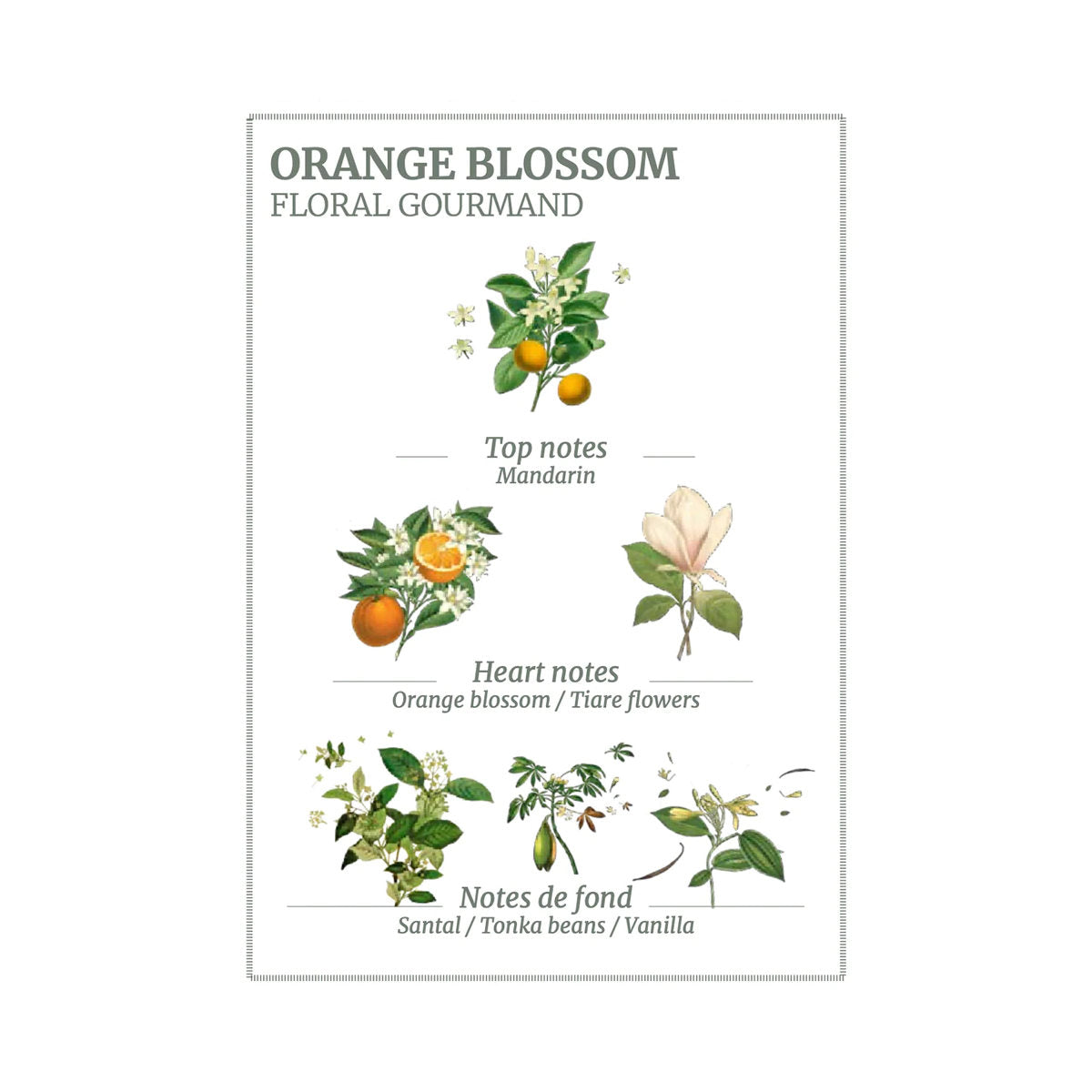 A sparkling, tangy floral fragrance with orange blossom absolute. After a vegetal start of "petit grain", a joyful and addictive orange blossom fragrance emerges, revealing sunny and generous heart notes. Gathered at the beginning of spring, orange blossom spreads a unique sunny and enchanting trail. Its citrus freshness reflects the Mediterranean brightness, a true ode to the light and lightness.