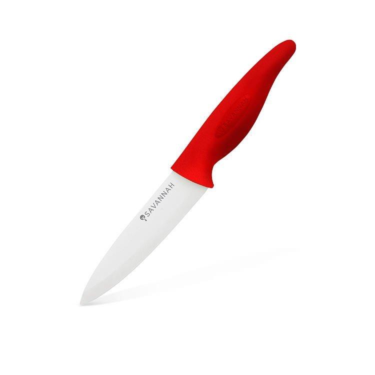 The Savannah Ceramic Preparation Knife with Sheath in Red is a must-have tool for any kitchen. Made from high-quality ceramic, this 13cm preparation knife features an ultra-sharp diamond sharpened blade that is Ideal for slicing, mincing and dicing of fruit, vegetables and boneless meat. Its compact size and lightweight design make it the perfect choice for small kitchen tasks.