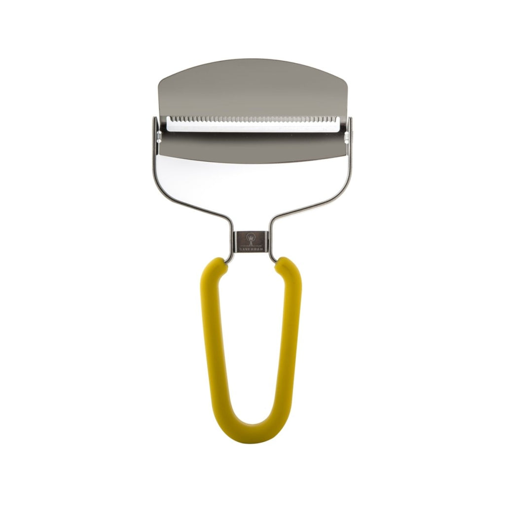 Take the strain out of slicing hard cheeses! Quickly and easily slice cheese for antipasto/platters/sandwiches and more. Can also be used to widely slice a variety of fruits and vegetables. Flexible Japanese steel blade with sharp serrated edge makes it a breeze to slice even the hardest cheeses. Ergonomic design suitable for right and left handed use.