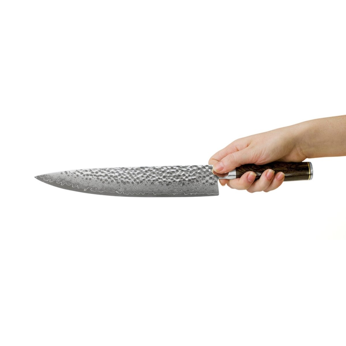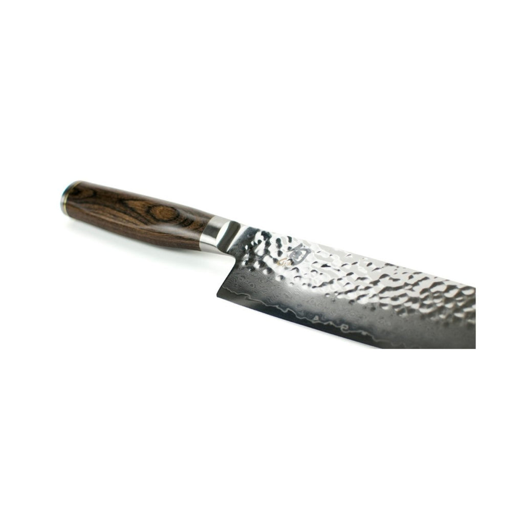 The SHUN Premier Chef's Knife 25cm is the ideal kitchen knife for those who want both style and functionality. Thanks to its Damascus blade exterior, the knife is not only beautiful but also extremely sharp, making it perfect for slicing through small and large ingredients alike. The blade is also hand-hammered and sharpened at an optimum angle, which means that it will stay sharp for a long time without needing to be resharpened. This makes the SHUN Premier Chef's Knife 25cm the perfect choice for anyone who wants a high-quality, all-purpose kitchen knife that they can rely on.