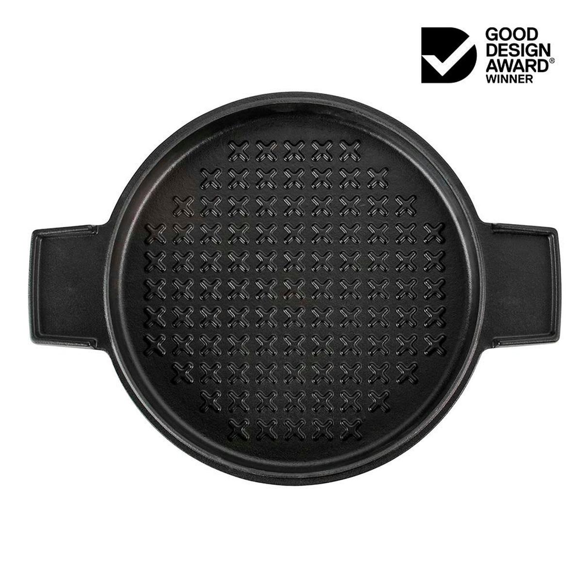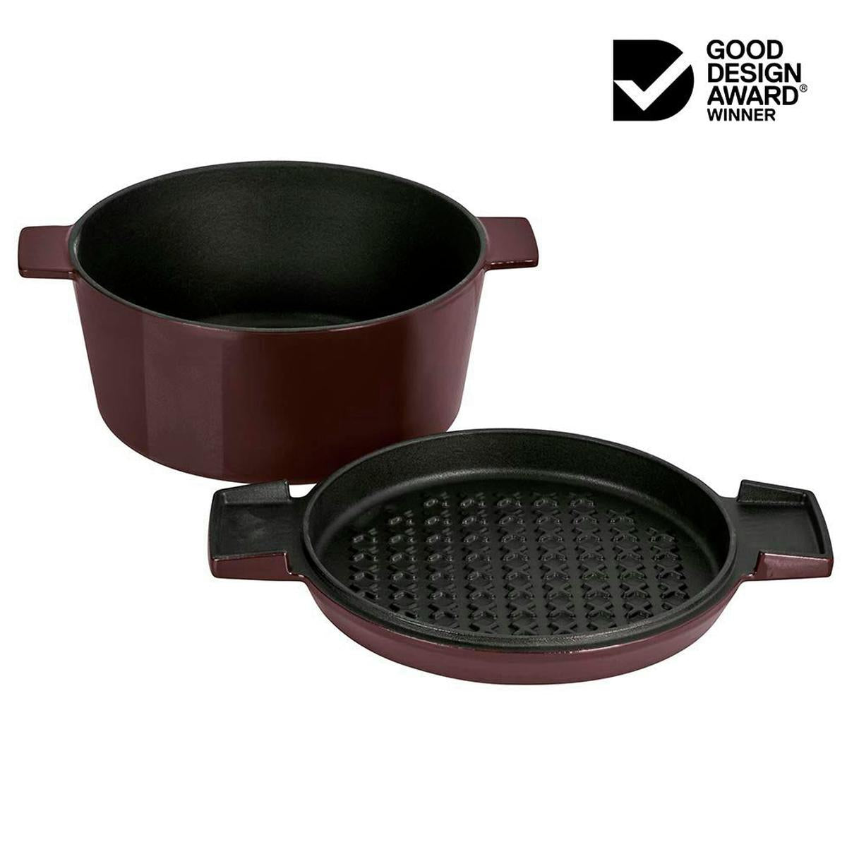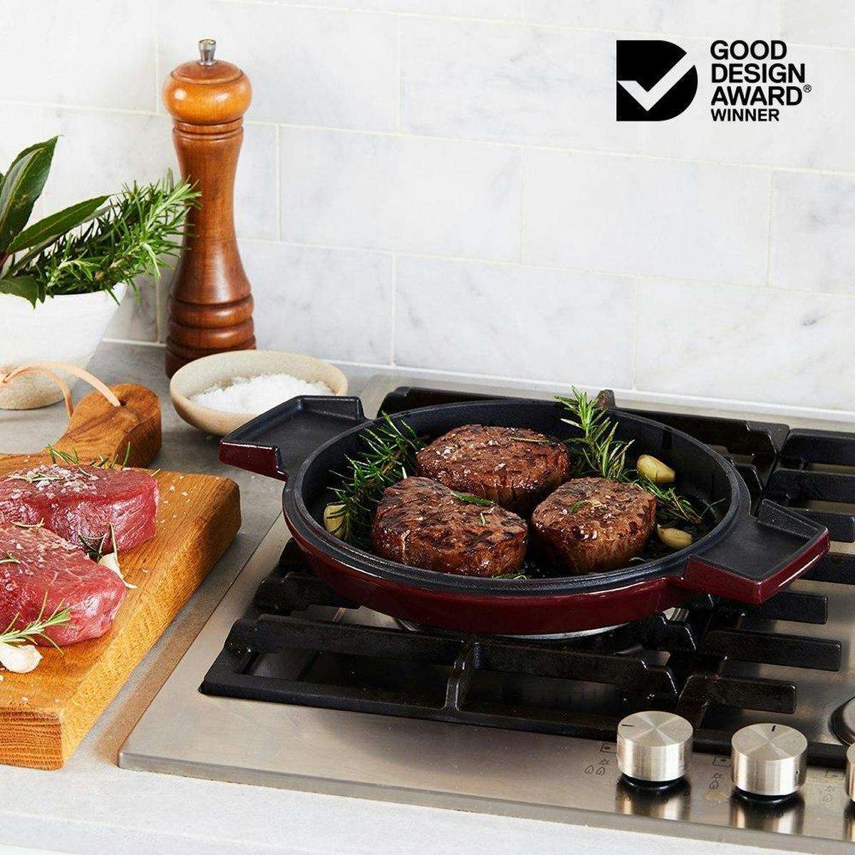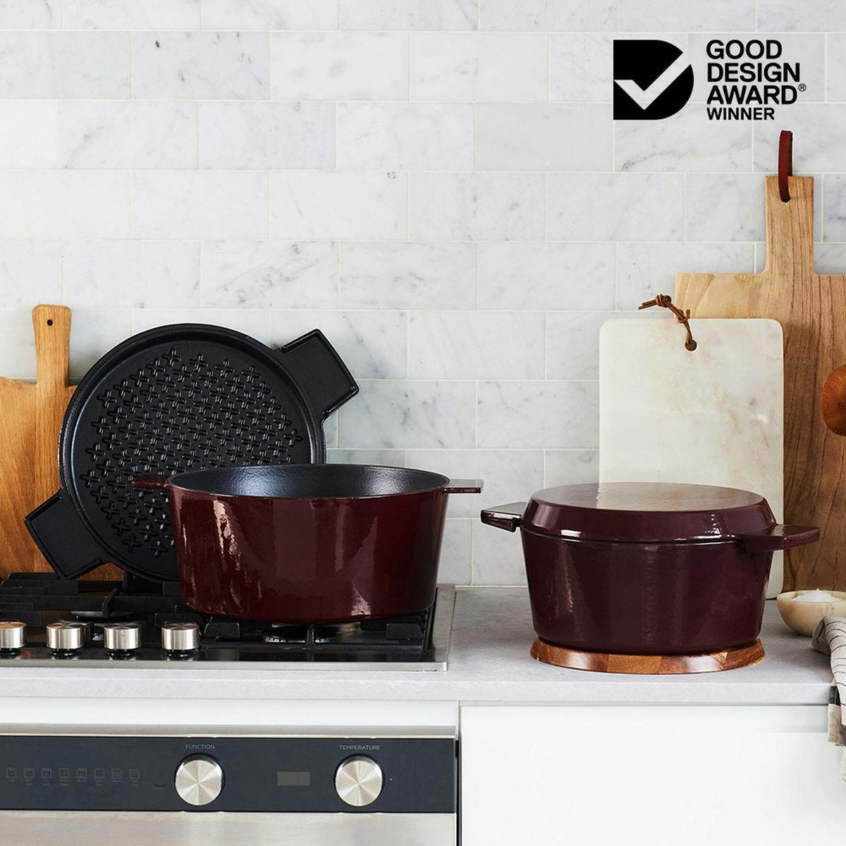 Our International Award-Winning FRENCH OVEN GRILL DUO serves as a saucepan and stockpot, grill, roasting pan and bread cloche. Its striking design and bold high gloss colours create a statement in any kitchen. The durable enamelled cast iron interior is stain-resistant. French Ovens can be used for many types of cooking – roasting, slow cooking, braising, searing, sautéing, frying, bread, soups, sauces and steaming. Slow cooking in a cast iron French Oven keeps the moisture in and the temperature even. To add additional favour, use it on the cooktop to brown meat before adding other ingredients. The dual-purpose lid can also be used to roast on. The dual-purpose lid is also a grill pan on the cooktop. Perfect for steaks and grilled vegetables all year round. The raised crosses create perfect sear marks every time and allow oil to drain away for healthier results. Induction capable, stain resistant and with a 50 year guarantee.