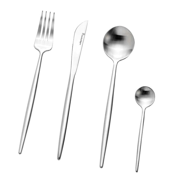 Add a touch of designer style to your table with Piper Satin. The elegantly slim handles in satin-brushed finish are sure to impress. Crafted from premium 18/10 stainless steel to last a life time. Place setting for four: 4 Dinner Knives 4 Dinner Forks 4 Dessert Spoons 4 Teaspoons