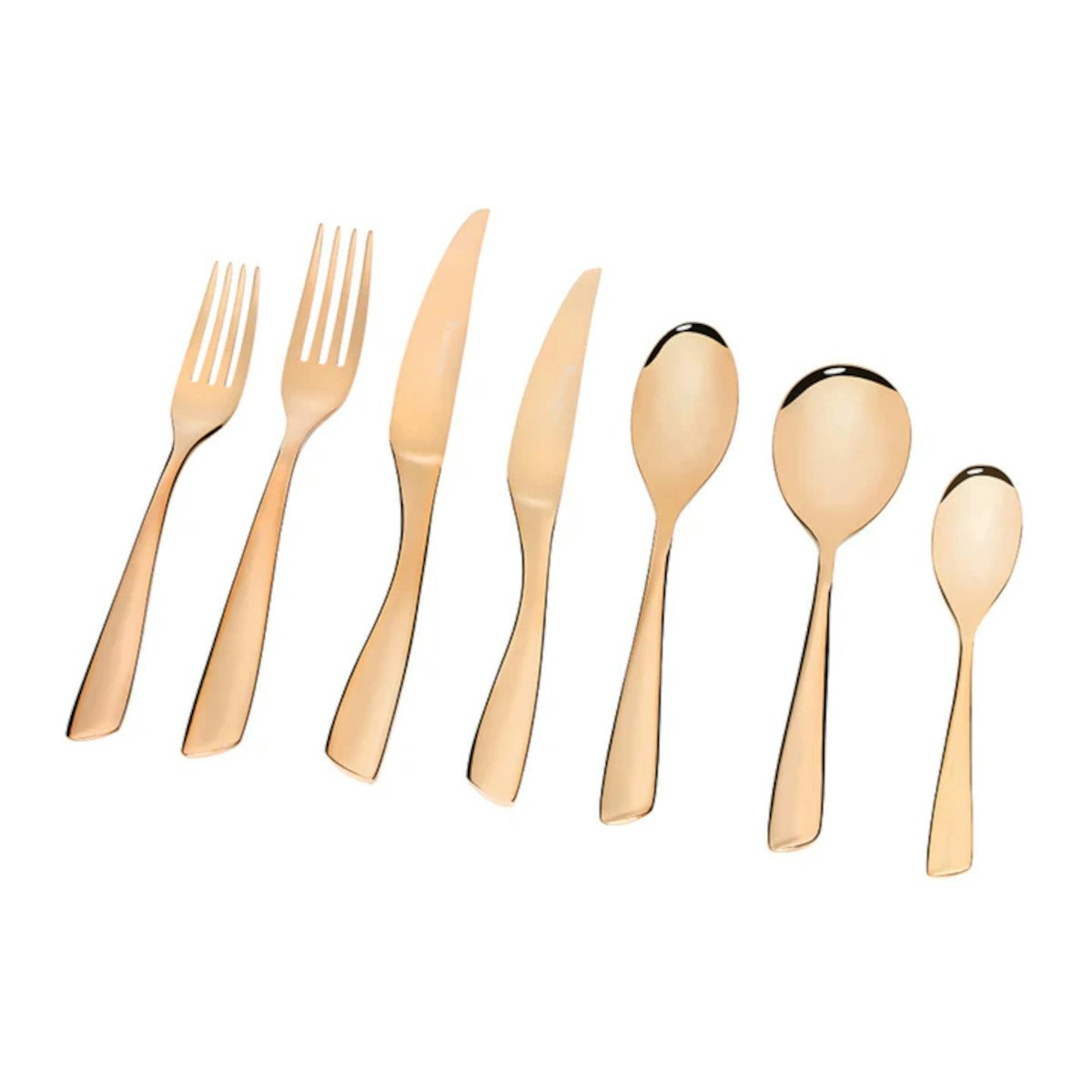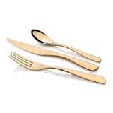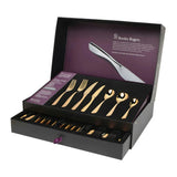 Ultra-modern design with an ergonomic-inspired handle. Its gold titanium coating makes it stand out. Forged from premium 18/10 heavyweight stainless steel with a high-quality mirror finish. Formal place setting for eight with 8 dinner knives, 8 dinner forks, 8 entree knives, 8 entree forks, 8 dessert spoons, 8 soup spoons, and 8 teaspoons. Comes in a premium gift box with a removable storage drawer and a 50-year guarantee.