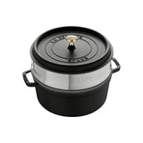 Heavy, tight fitting flat lid features self-basting spikes for continuous, even distribution of juices throughout cooking