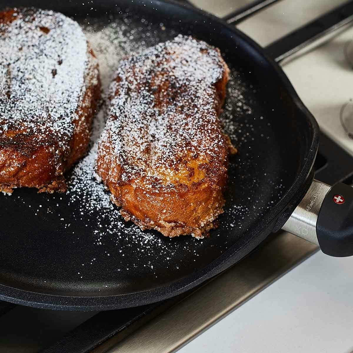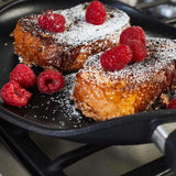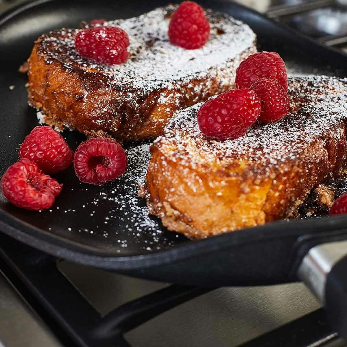 Delicate treats with unlimited possibilities, crepes are customizable for every taste bud. Sweet or savory, drizzle chocolate or sprinkle cheese with ease without worrying about scrubbing and soaking your pan afterwards. Simply wash with warm water and a soft, soapy sponge for a dazzling clean. The comfortable, ergonomic handles are designed to stay cool on the stove top and are oven safe up to 260°C. The brushed stainless steel fame guard provides added elegance to the overall sleek and sophisticated design, while the extra thick, cast aluminum body provides perfectly even heat distribution.
