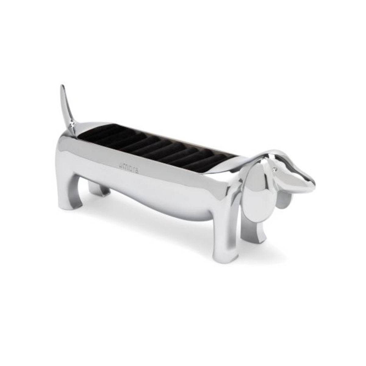 A playful dachshund-inspired ring holder, the Dachsie Ring Holder holds and protects your rings with its velvet padded base. Made of cast metal with a shiny metallic finish, this ring holder is easy to clean and makes for a perfect gift to any family, co-worker or friend. Its sleek design ensures it complements a variety of other dΓ©cor whether placed on your nightstand, dresser or desk. With ample storage, this ring holder can hold multiple rings of various sizes.