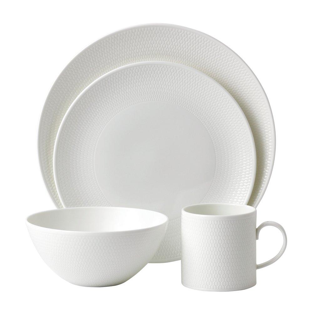 The Gio 16 piece set in fine white bone china includes: four plates 28cm, four plates 23cm, four cereal bowls 16cm and four 300ml mugs. Dishwasher and microwave safe. Presented in a signature Wedgwood blue gift box.